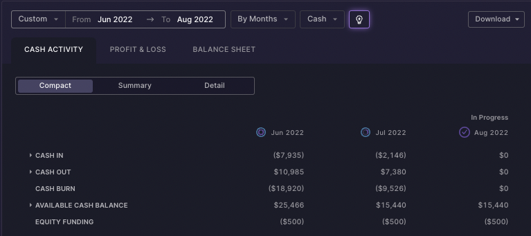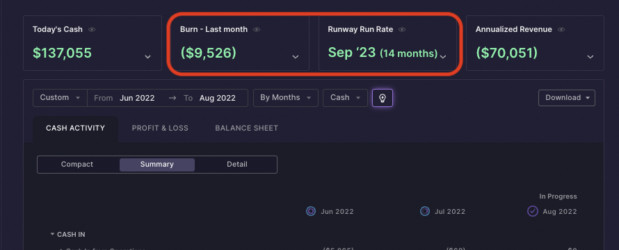 You will notice that the July cash burn number of ($9,526) in the Cash Activity Report is the same as in the burn card displayed above. The Cash Activity Report is where you can see the detail of that burn number!