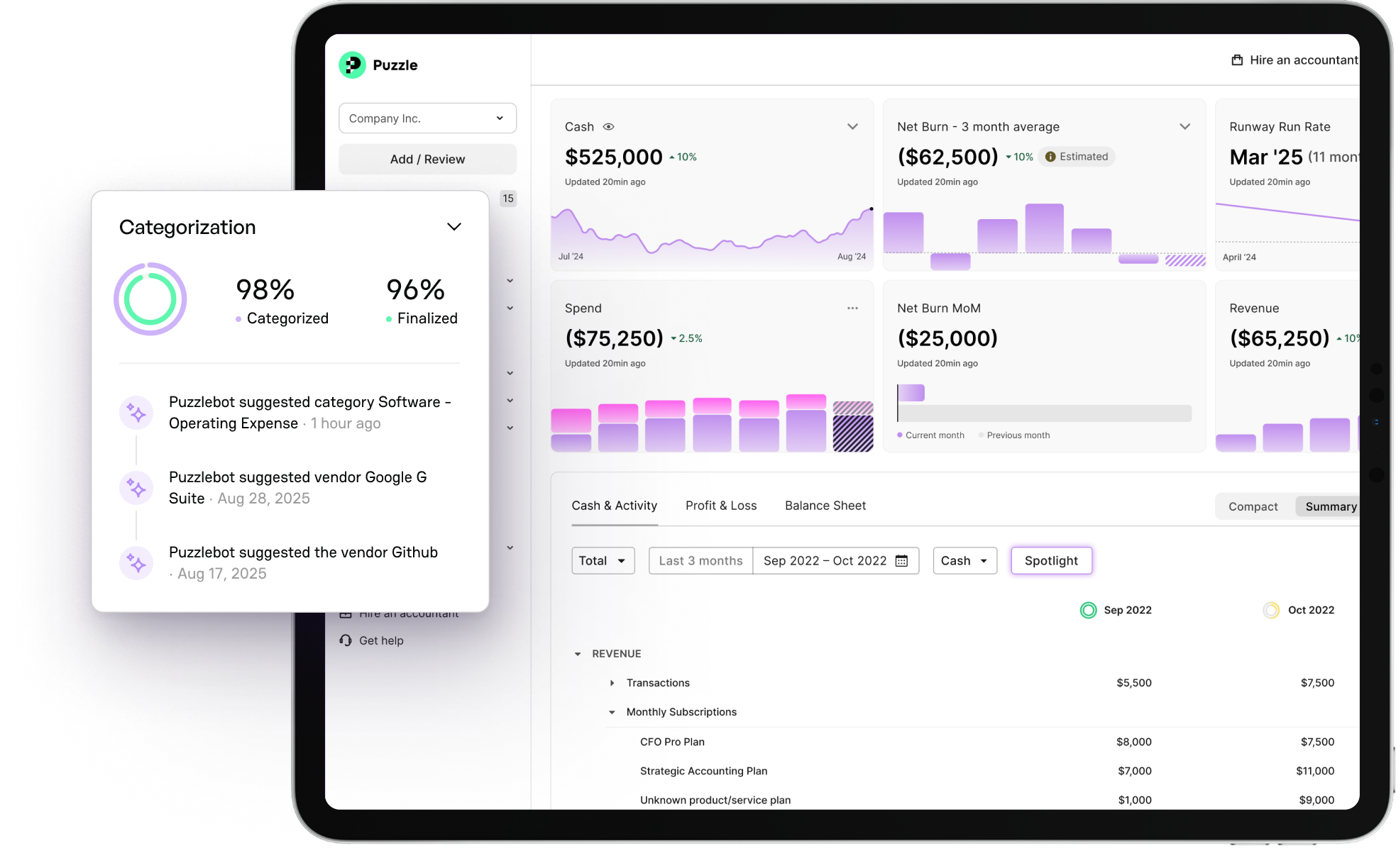 While QuickBooks traps you in manual workflows, Puzzle delivers automated insights the moment transactions happen.